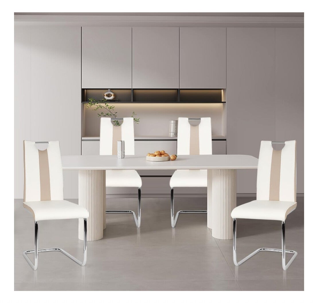 Lot de 4 Chaises à Manger Simili Cuir, Chaises Salle à Manger en Forme Zigzag avec Siege Rembourre et Dossier Haute 50 cm, Chaise de Salon Confortable Moderne (Blanc-Beige)
